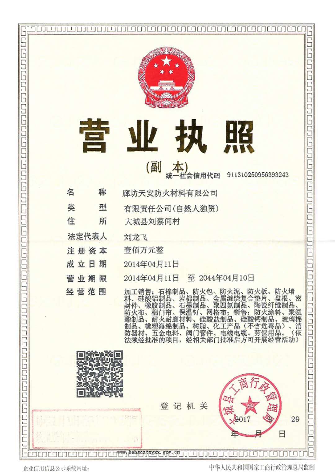 廊坊天安防火材料有限公司,座落在河北省大城縣留各莊工業區,位于京、津、保三角地帶。 地理位置優越!交通十分便利! 我公司擁有國內先進的工藝和設備,企業規模、產品質量在國內堪稱一流。 我公司主要產品有阻火包、柔性有機堵料、石棉布、石棉繩、石棉帶、石棉絨、石棉板、石棉紙、石棉被、阻火模塊、電纜防火涂料、鋼結構防火涂料、防火板、硅膠布、三防布、玻璃纖維布、硅酸鋁纖維板、 硅酸鋁氈、陶瓷纖維板、陶瓷纖維氈、陶瓷纖維紙、聚四氟乙烯制品、齒形墊、石墨制品、各種盤根、金屬纏繞墊、密封材料、外墻保溫釘、網格布等產品。產品規格齊全! 質量穩定,深受廣大客戶的認可和好評! “以優取勝、以誠取信、質量第一、用戶至上”是我公司的宗旨,我公司全體員工將以“開拓、進取、求實、創新”的精神與國內外同仁攜手共進共創輝煌,共創美好的明天,并期盼更好的與廣大新老客戶真誠合作。
